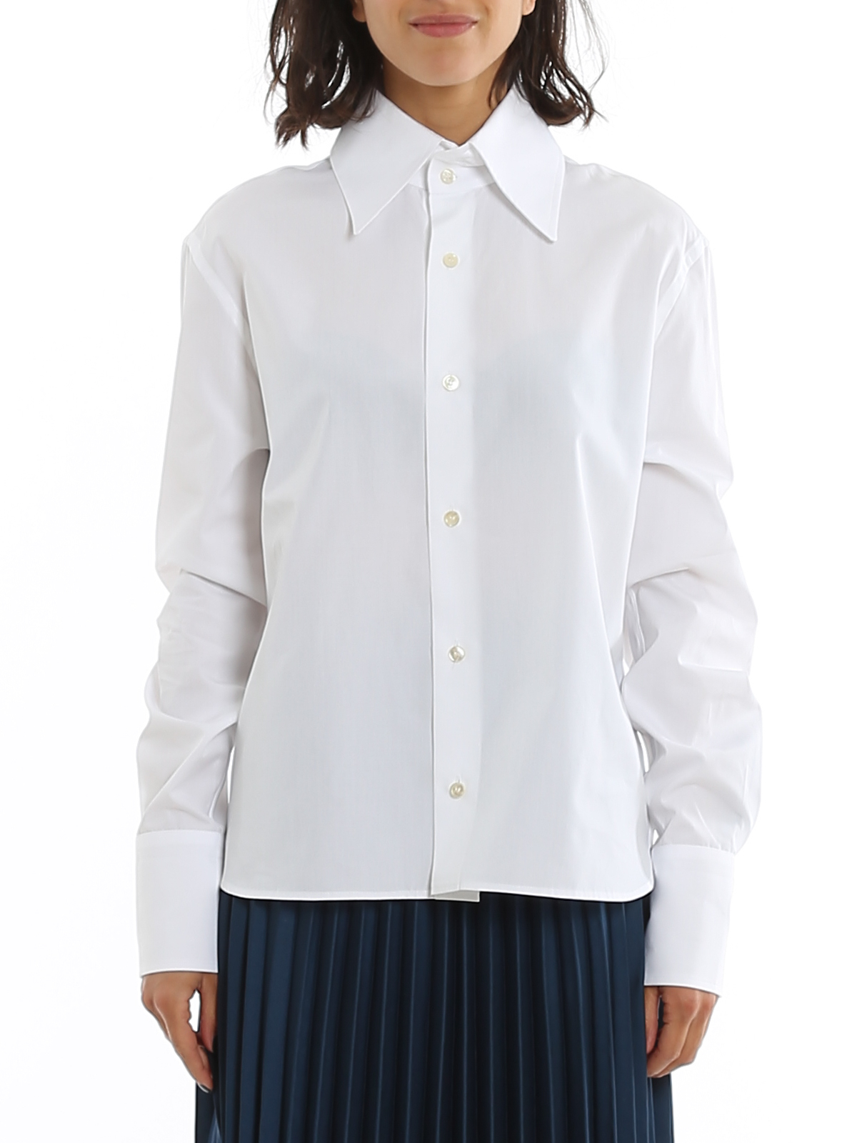Cotton poplin shirt detailed with maxi pointy collar and high cuffs.