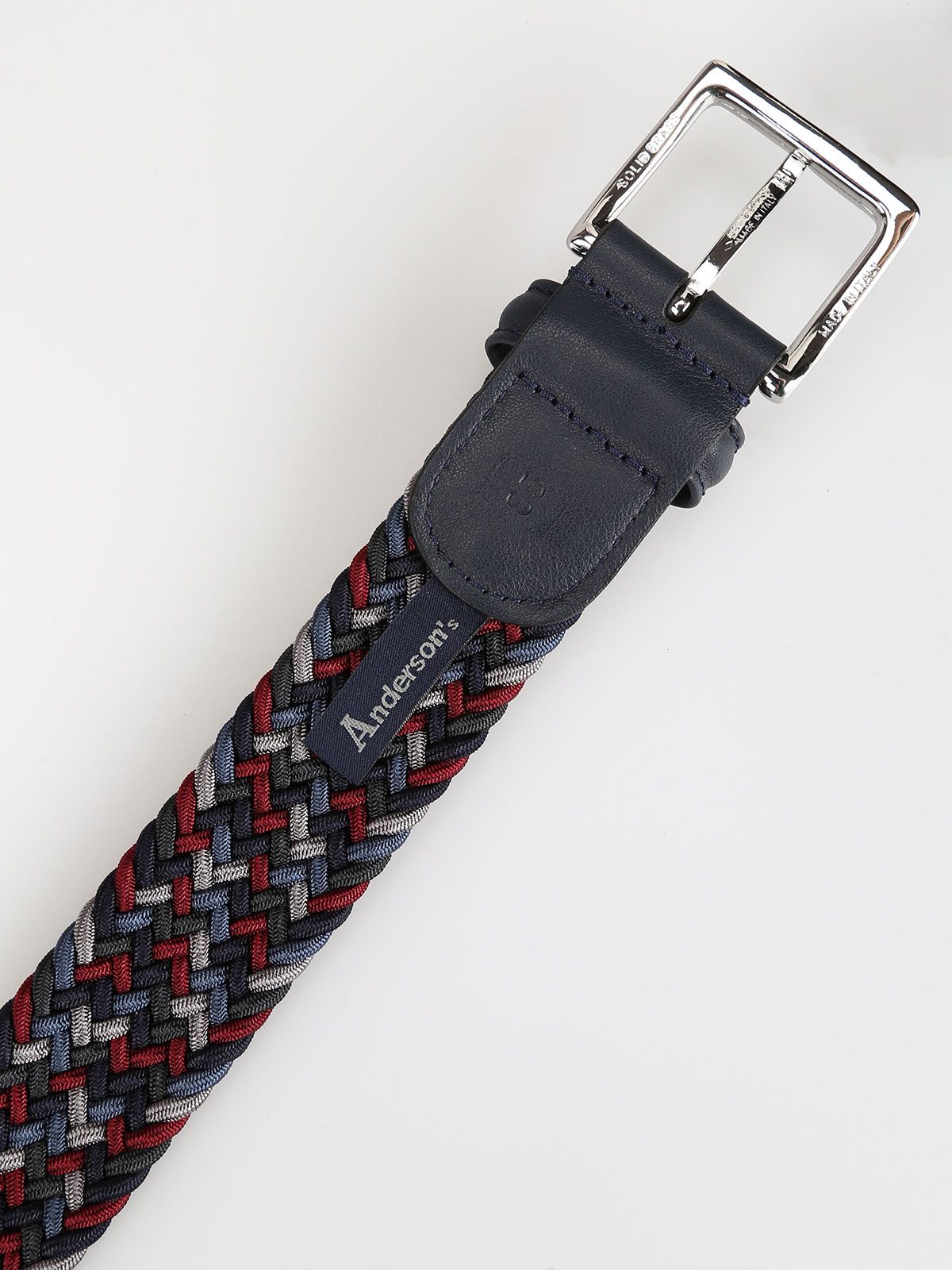 Multicolour woven stretch fabric belt detailed with leather inserts and satinized silver tone metal buckle.