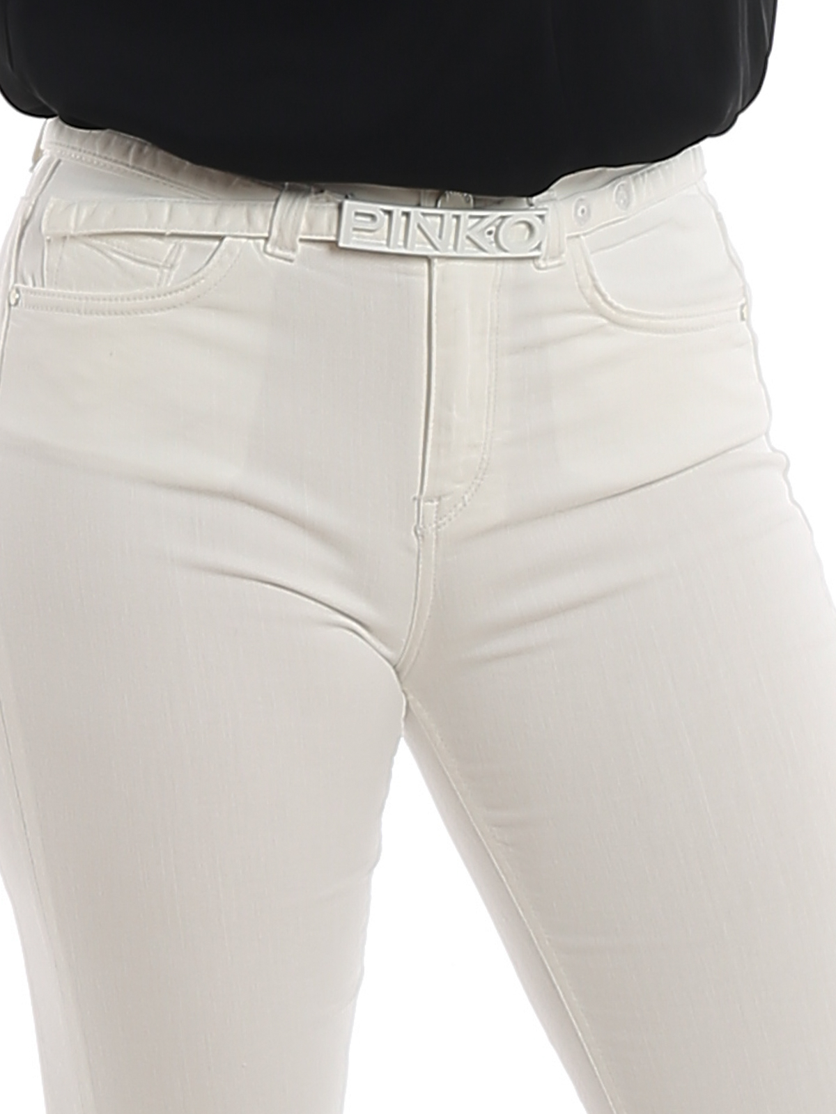 Denim flared jeans detailed with five pockets, belt loops, matching thin belt with enamelled logo lettering metal buckle and zip and button fastening.