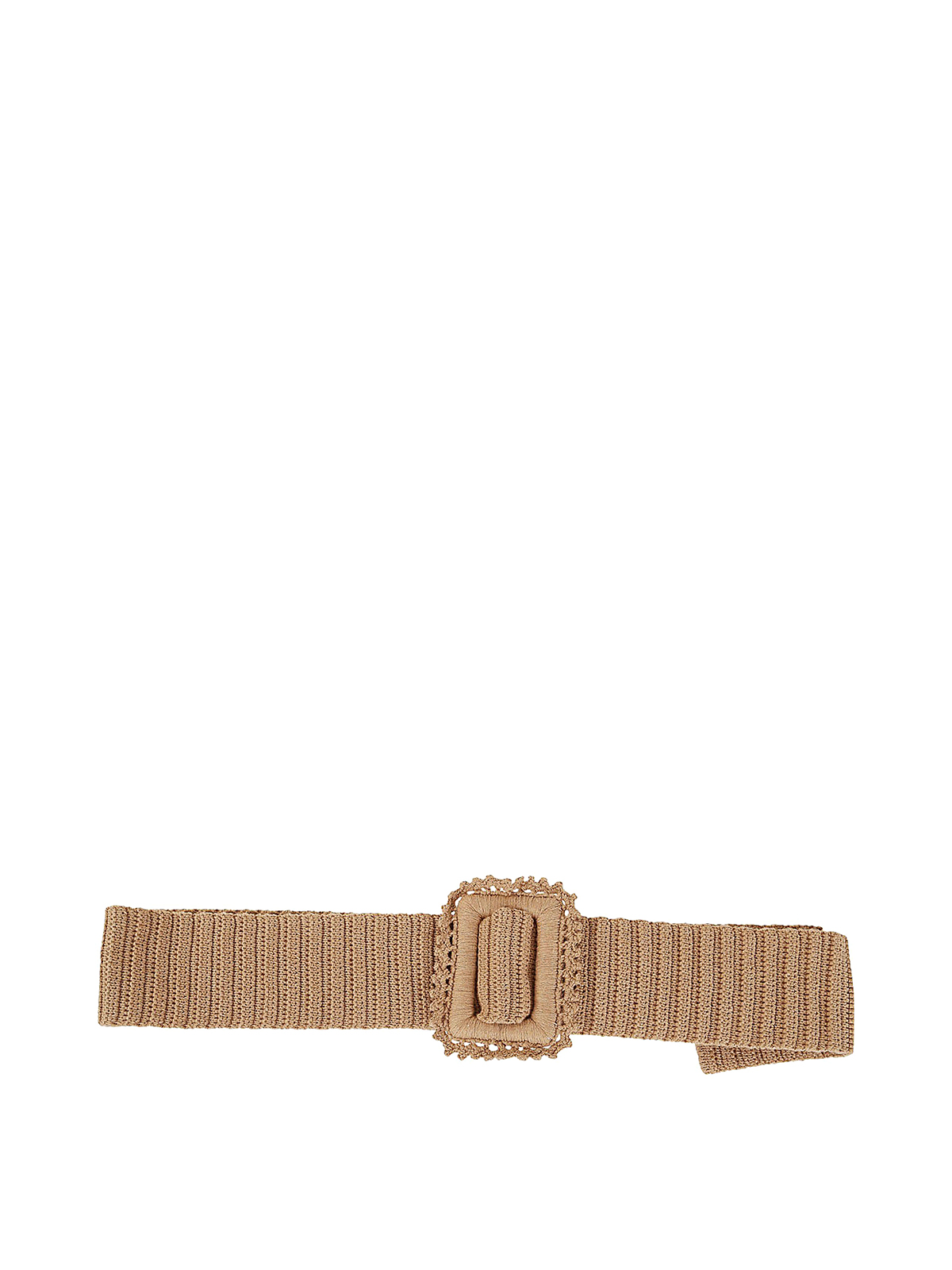 Fabric belt featuring rectangular buckle, macramé details and a ribbed motif.