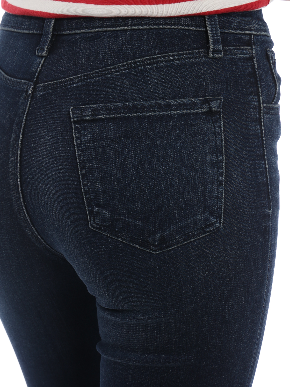 Stretch denim five pocket jeans featuring high rise, belt loops, used effect details, zip and button fastening and flared bottom.