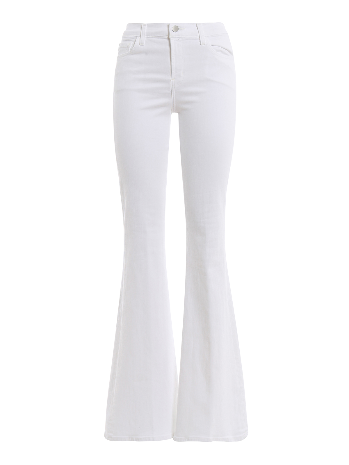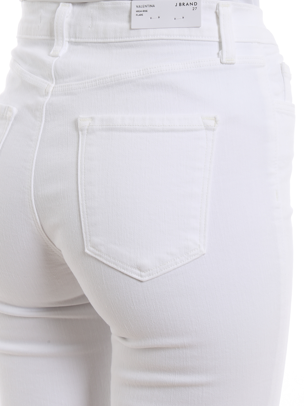 Super stretch denim high waist flared jeans featuring zip and button fastening.