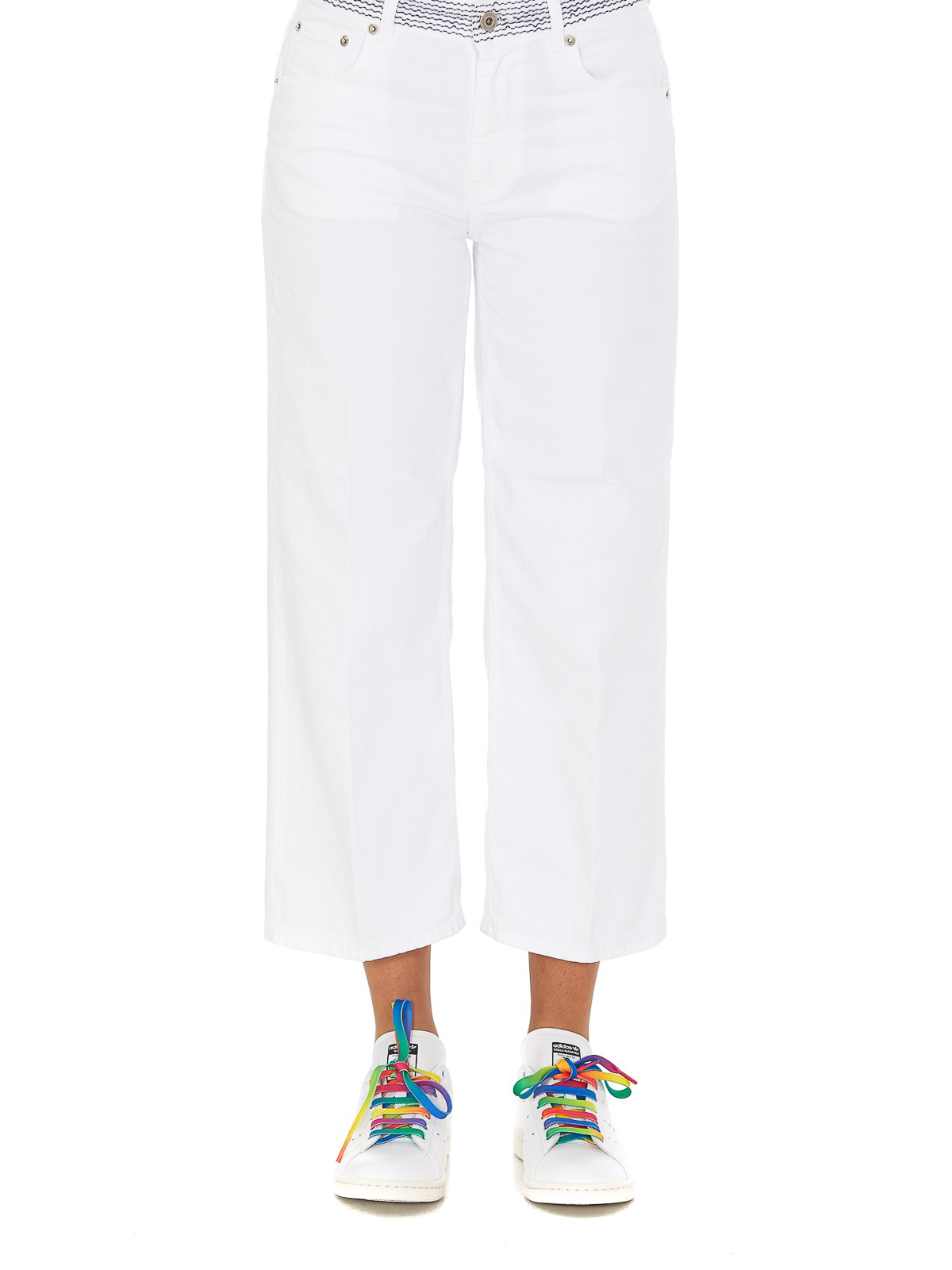 Stretch denim five pockets cropped jeans detailed with wavy embroidery at waist, wide leg, belt loops and zip and button fastening.